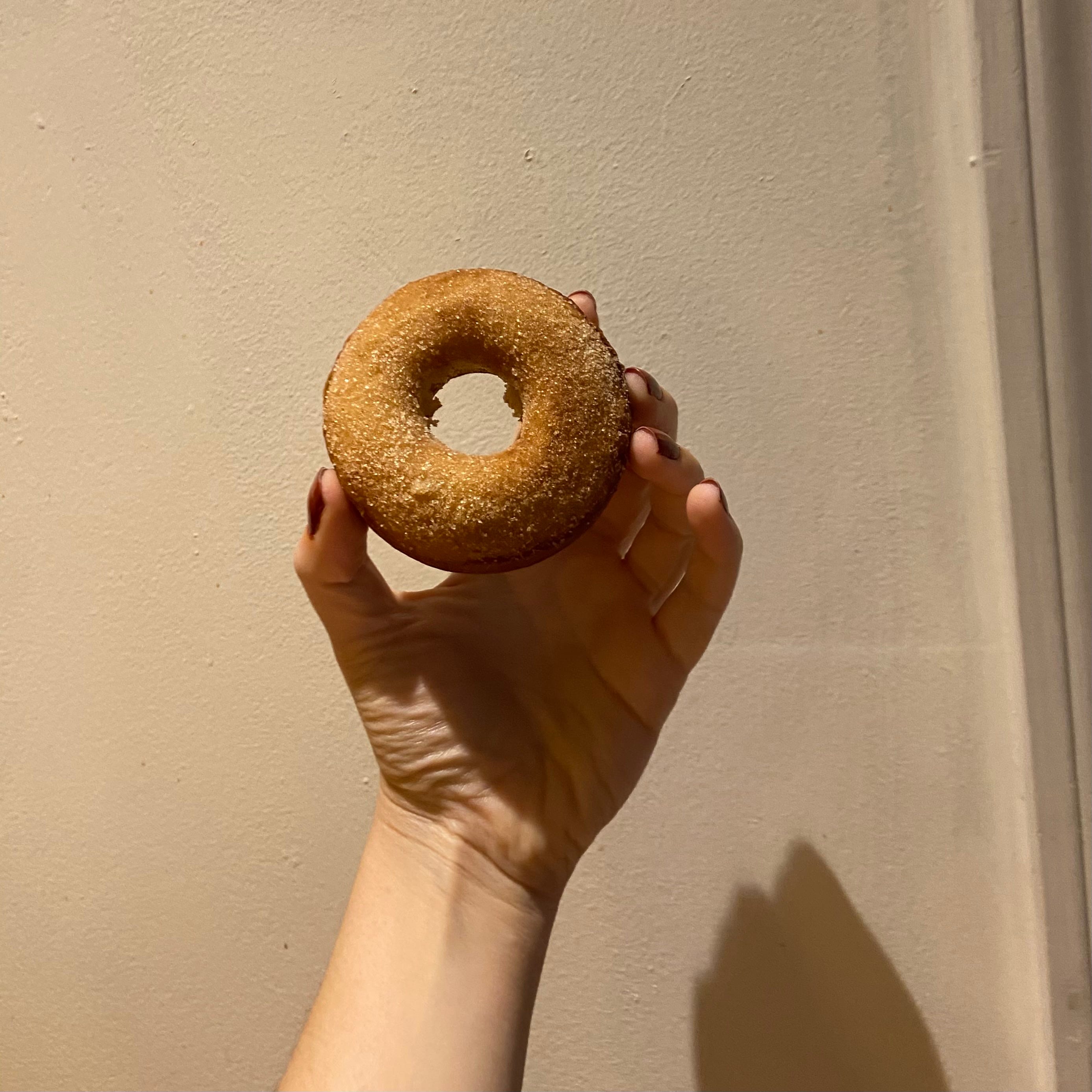 remove from the oven. in a separate bowl, melt together 2 tbsp of butter (or more, if needed). in another bowl, mix together two parts white sugar and one part cinnamon. when each donut is cool enough to handle, cover the lighter top with butter and roll in the cinnamon sugar.